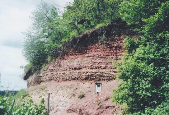 Eine Million Jahre Erdgeschichte liegen am Geologie-Lehrpfad "Heilbronner Keuperweg" im Osten der Stadt offen vor uns. Die Keuperschichten bilden die Grenze zwischen Weinberg und Wald. Sie stammen aus dem Erdmittelalter (Mesozoikum) vor ca. 225 Millionen Jahren, als der Wechsel von Überschwemmung und Trockenheit in großen Senken eine Schicht nach der anderen erzeugte. "Nirgendwo in Nord-Württemberg sind diese Gesteinsschichten, ihre Verbindung und ihre Geschichte besser kennen zu lernen als hier."* Aber auch bei anderen Heilbronner Weinbergen, wie ich unten zeige. Die oberen Schichten werden aufgrund der in ihnen vorkommenden Estherien - das sind kleine Krebse mit einem zweiklappigen Gehäuse - Estherienschichten genannt. Die darüber liegende Sandsteinschicht hat diese eher lockeren Schichten vor der Erosion bewahrt und so für die Berge gesorgt, die Heilbronn von drei Seiten umgeben und schützen und die Grundlage des hiesigen Weinbaues bilden. Dieser fälschlich "Schilfsandstein" genannte warmgelbe Stein gilt als ursprüngliches Baumaterial der Stadt Heilbronn, wovon Heilbronns schönste historische Bauten zeugen, und war darüber hinaus jahrhundertelang auch im In- und Ausland sehr geschätzt. Die Stadt war damals im doppelten Sinne "steinreich". Der Schilfsandstein bildet eine massige einheitliche Schicht bis 27 m Stärke (Information im Steinbruch: bis 35 m). Direkt am südlichen Beginn des Keuperweges liegt der Eingang zum ehemaligen, seit 1972 unter Naturschutz gestellten aufgelassenen Schilfsandsteinbruch, wo an heißen Sommertagen neben dem Schatten der Wände und Bäume verdunstendes Sickerwasser für angenehme Kühle sorgt, im kühlsten Bereich von mir gemessen bis 7º kühler, bei 28º im Eingangsbereich. - Seit 1883 ist Heilbronn auch eine Bergbaustadt. In ca. 200 m Tiefe wird Steinsalz abgebaut und in 2 Schächten gefördert. Das mächtige Steinsalzlager stammt aus dem Mittleren Muschelkalk, den Schichten unterhalb des Keupers. Dank der es begünstigenden Geologie bleibt Heilbronn also auch ohne Schilfsandsteingewinnung weiterhin nicht nur weinreich, sondern auch steinreich und hoffentlich weiterhin von Bergschlägen verschont, wie ich sie aus meiner Heimat kenne (s. die nachfolgende Datei). *Entnommen dem Faltblatt "Der Heilbronner Keuperweg" der Stadtinformation Heilbronn. Dort erhältlich.